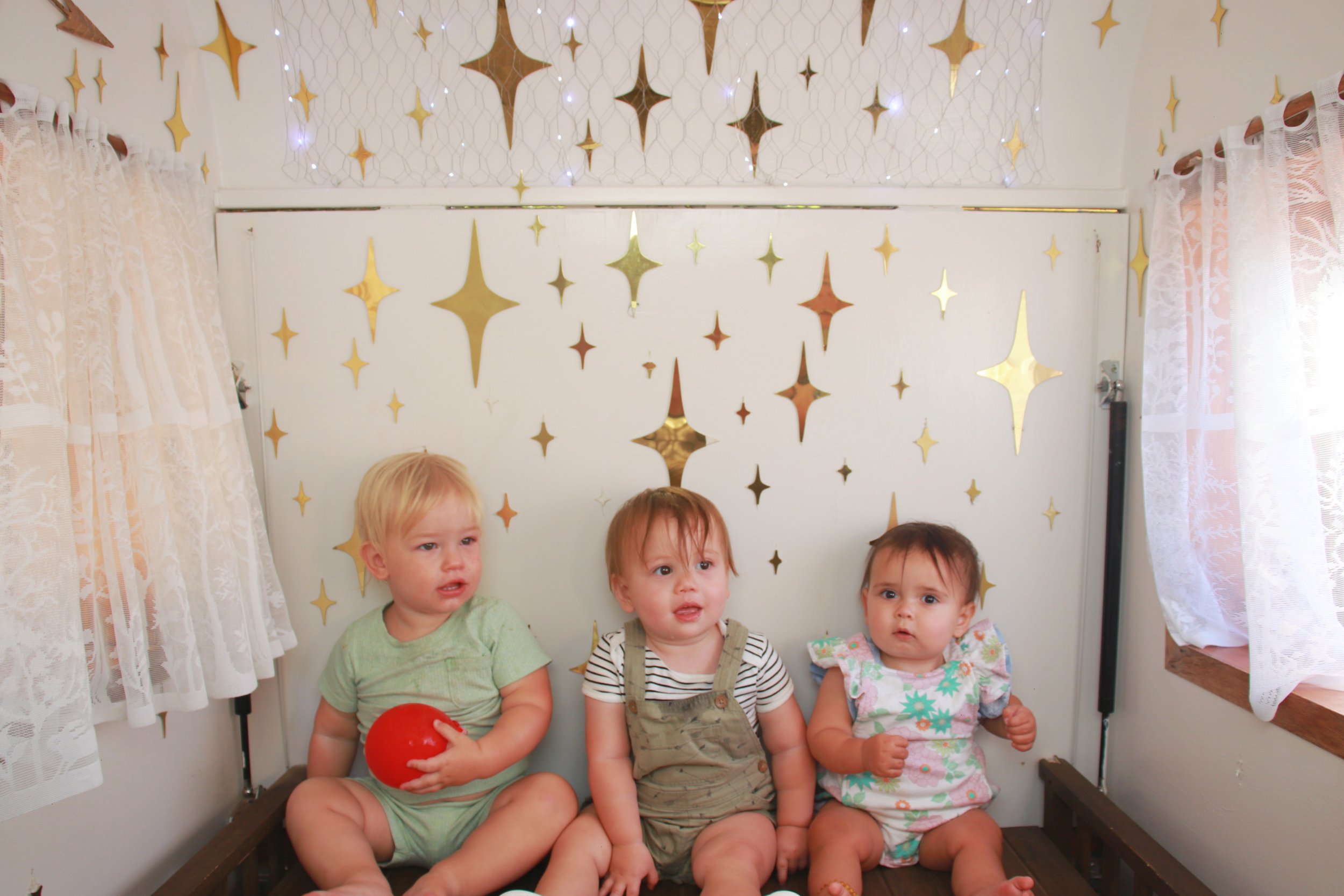 Interior is composed of wooden walls painted in daisy white with lovely white lace curtains along all windows adding an ethereal touch of elegance. Gleaming golden stars scatter along the back reflecting the stunning fairy lights across the ceiling.